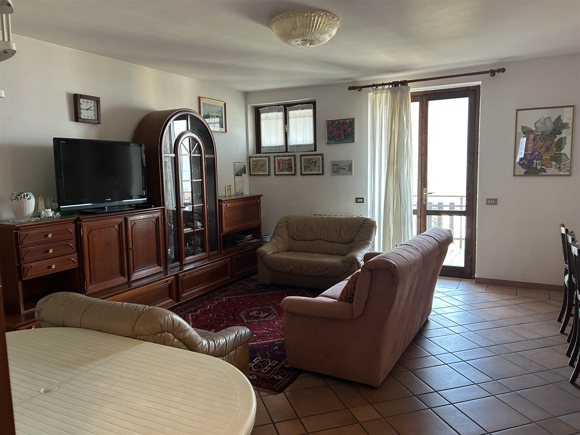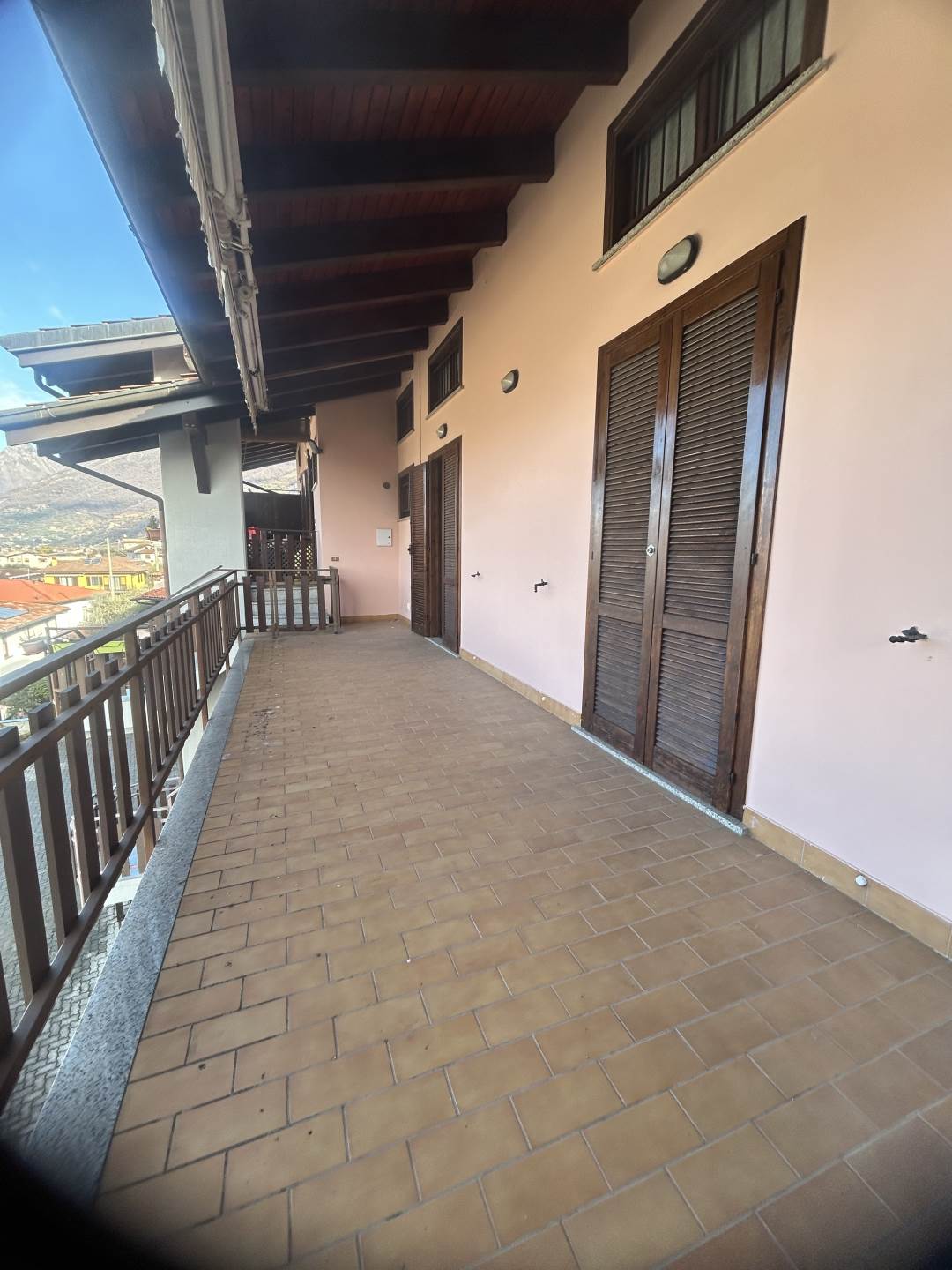 L’appartamento, con accesso mediante il terrazzo da doppia scala esterna, si sviluppa al piano per mq. 87 ed è composto da spazioso soggiorno con grande cucina a vista, completa di camino e forno a legna; la zona giorno è collegata al terrazzo da due porte/finestre, con ante blindate, che si affacciano su una ampia terrazza di mq. 24, orientata verso il lago e dalla quale si può godere di una splendida vista sia verso il lago con al centro Monteisola e l’isola di Loreto, sia verso le montagne circostanti.